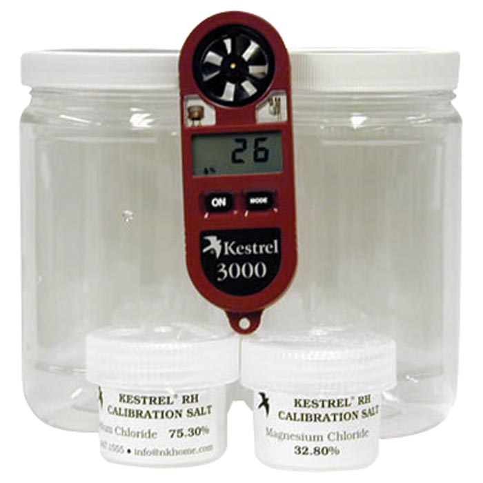 The Kestrel should be recalibrated if the Relative Humidity (RH) sensor has been replaced or has shown drift in its RH measurement. This manual explains the steps for calibrating the humidity measurement for the Kestrel. The large container is used to create a stable environment. The small containers are used to hold the saturated salt solution. The saturated salt solutions generate well-defined humidity when they are confined to a contained environment. The RH calibration kit includes the following items: 2 clear, sealable containers. 1 small container with magnesium chloride solution. 1 small container with sodium chloride solution. 2 wooden scrapers.