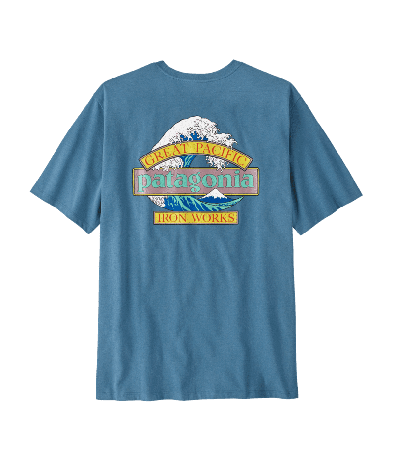 Our Great Waves logo combines Patagonia's word mark with Hokusai's iconic wave and Great Pacific Iron Works, the name of our first retail store, which is a short walk from some great waves in Ventura, California. We screen-printed it on the Men's Great Waves Responsibili-TeeŽ, a classic crewneck tee made of a soft, durable blend of 50/50 recycled cotton/postconsumer recycled polyester jersey. By utilizing fabric scraps and recycled bottles, this 100% recycled garment reduces our reliance on virgin raw materials. Know better; do better. Made in a Fair Trade Certified factory.