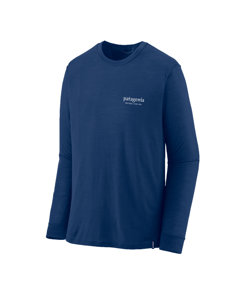 Patagonia Mens L/S Cap Cool Merino Blend Graphic Shirt Heritage Header: Clement Blue